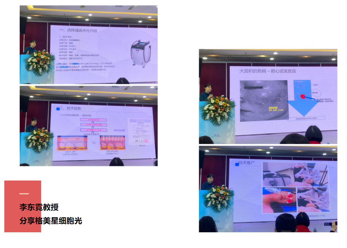 在分论坛激光美容论坛中,广东省第二人民医院整形美容激光专科主任医师、中国医师协会美容与整形美容分会激光专业学组委员李东霓教授就“中药化瘀颗粒联合点阵强脉冲光治疗黄褐斑的临床应用”这一课题,展开对黄褐斑的临床治疗经验分享,并指出格美星细胞光作为点阵式强脉冲光相较于传统IPL治疗,具有疼痛感更低、临床体验更舒适、治疗更安全且显效明确的特点。