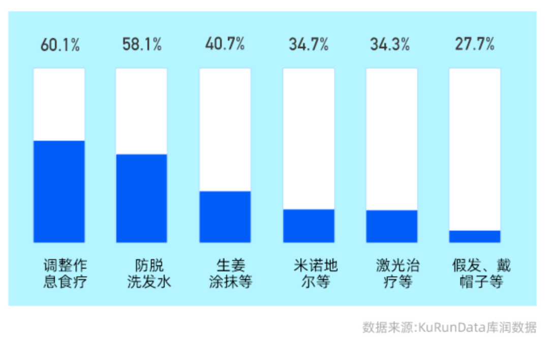 《2023当代年轻人脱发图鉴》数据显示,60.1%以上的人会先改变不良生活习惯,使用防脱洗发水进行防脱的人群占比58.10%;用土偏方防脱的人群,占比40.7%;使用药物防脱的人群,占比34.7%;用激光治疗的人群,占比34.3%;使用假发、戴帽子的人群,占比27.7%。