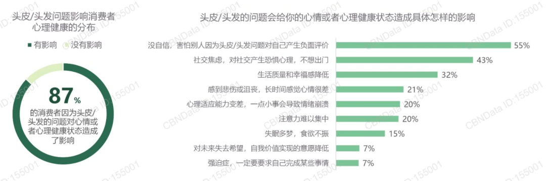 据CBNData发布的《2023国民头皮健康白皮书》显示,近9成受访者表示会因为头皮/头发的问题影响心情或心理健康,产生自信降低、社交焦虑、悲伤沮丧等问题。